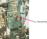 Exposed in-running nips bewteen rollers.