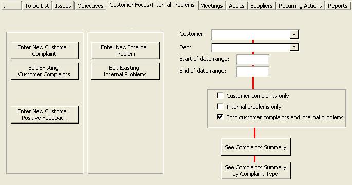 The page shown to the right is the customer focus menu. The left hand side of the page controls input of the above factors; the right hand side enables reports to be generated. These reports can be filtered for any combination of: