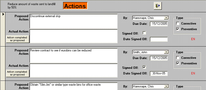 When you assign an action (in this case, it's to an objective to reduce landfill waste by 50%), you define the proposed action, who will be responsible for ensuring that the action is carried out and the due date for completion. The action will appear on that person's TO DO list. One option in INTACT is to automatically e-mail that person with his revised TO DO list. There is a mandatory (within INTACT) requirement to define whether the action is corrective or preventive; INTACT can provide counts of these as part of its reporting function.